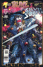 This Issue's Synopsis: "July 4, 1993. 5:59 am. Rune, Prince of Void, Savaged and stripped to the core by the powers he would wield, is sole witness to the birth of a god. Rune has been worshipped under many names throughout the eons...Anasi...The Prince of Void--The Dark God. But for all his sorcery, Rune is a false diety, powerless before the ultimate manifestation of cosmic energy...the chaos storm of Shu-Ji...the genesis of...Gemini. Noel Robinson & Eric Johnson struggle against their mutual destiny...but their star born genes and chromosomes were destined for this moment...this time of times--as the synthesis accelerates, flesh and souls unite...melding into the raging core of a newborn star! Their screams are ripped from them in shrill octaves unknown in this world. Then...their very atoms pause and mingle...as...a sudden shimmering calm falls upon twin bodies that coalesce into one...and a reluctant young god is born into the world on the eve of its destruction. WE ARE ONE. WE LIVE!" --Rune, volume 1, # 5 Rune forces the two young men, Erik and Noel together, and with the power of the Shu-Ji, they are bonded into one entity, Gemini. As this is going on, Genie manages to restore order to the Aladdin complex, imitating Rayder, and realising that with "Rayder" as its figurehead, Genie now has control over all Aladdin. Meanwhile, Rune is dying...again. This time, the flesh is seared from his body, totally withering away in the awsome power that resulted from the "Shu-Ji storm". He watches as the entity brings life anew to an entity that appears to look like Markie, dead for a time now. As they are reunited, something is revealed to be on the moon, an alien entity that has changed some of the world's populace. Rune calls Gemini over to himself. Genie orders the termination of the spacewatch. Rune cons Gemini into "blessing" him with a kiss. At this, Rune bites back, and steals Gemini's power. Realizing ultimate power at last, he revels in this, before realizing that he can't control it, and as such, the earth...HIS earth...is doomed. With the traditional bite in the neck, Rune transfers his powers back to the young godling. Gemini is then subjected to his "dream" again, but sees through it, prooving his will is strong. When he declines to be Rune's servant, the sorceror leaves, stating that when next they meat, he will kill his "son". Flying off, Rune warns that he/they can seek him at their peril. Gemini retrieves the new life he created, and walks off, claiming that their love will keep them together, always. Meanwhile, Genie puts into motion another "experiment" to harness the Shu-Ji. This issue was the apparent conclusion to the "Gemini Saga". Rune is empowered once more, just not as much as he'd like to be. Gemini is still on the loose, leaving stuff open for a storyline later. As usual, art is superb, story excellent. |