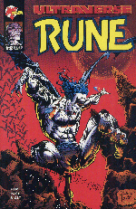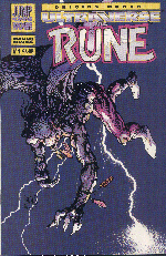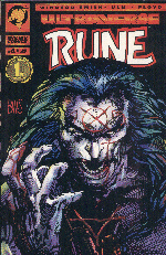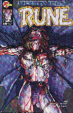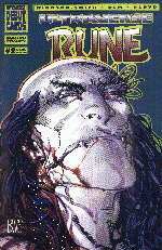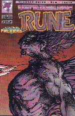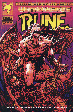 This Issue's Synopsis: The stones are cast.....and bait the user with hope. They appear to tell him something, then he states that it is the scent of power. Power to make himself whole again. Flashback: Rune is in an African village in 303 AD. Here, he is worshipped as a god. A woman is offered as a sacrifice to the god, which is gladly accepted. Later, 1895. A man writes to a friend, describing what surely must have been a dream--of someone who entered his study, to inquire about the secrets of dynamic energy and magnetism. A glass bauble was left behind, with a symbol, for fire...or perhaps...sorceror. November 1, 1952, Eniwetok Atoll. His rune-stones have led him here with a prophecy of power. In his haste for power, Rune is caught in the detonation of the hydrogen bomb. In its wake, he is left with a body ravaged by the explosion, and a disease eating away at him from within. June 24, 1993. A streetcar was hit by a bolt of energy from space. 59 passengers left frightened, a motorist comatose. And Edwin Doyle, confused, meets someone who had been awaiting this day. Rune leads Doyle home, where he soon mutates into the most powerful man on the planet. Still not comprehending what has happened, Doyle is murdered by Rune, who takes his life essence into himself. Rune is filled with raw power, and once more made whole, his body his to command! But the energy quickly drains away, as Rune realizes that it will take more to save himself. The next day, Rune catches another victim, this one dead-drunk. At the height of his powers, ANY prey would be fine for Rune. Sickly that he is now, the man's alcohol-filled blood is nothing but poison, causing Rune to vomit the blood, and leap to the sky to purge himself. Struck by lighting, the vampire is purged of the poison, but not the malignancy that knaws at his being. June 27, 1993--Mecca Flats, Arizona. An Aladdin operative watches a creature sitting near an abandoned Aladdin Facility. It scans the creature, realizing the fangs of a killer. Surprise is expressed as the creature begins eating a skull, and then lapses into a coma-like state. Two hours later, the subject awakens, and finds an object lying in the sand, with the Aladdin logo on it. The creature turns to look at the person watching it, then takes off, flying southwest towards Scottsdale, Arizona. "In the countless millenia before the dawn of mankind upon the planet Earth, there raged among the stars an imperious warlord whose insatiable lust for carnage destroyed entire races and culturs among the galaxies. With his vicitms numbering in the billions he was known by many names among the thousands of empires he destroyed. Prince of blood: his savagery in battle was but a prelude to his hedonistic rituals of eviscerating many of his victims and gorging on their flesh. Prince of Void: so called for the utter desolation left in his wake; relentlessly razing entire cities to smouldering husks. The Dark Lord: Finally defeated in a spectacular battle that raged for five hundred years, the bloodied prince fled to earth, a planet still in its infancy, where, among the burgeoning clans and tribes of early man he was worshipped as a god. Here, in hiding from his galactic enemies and in need of life-sustaining energy he fell victim to the withering power of the hydrogen bomb. Riddled with disease, the once conqueror of the stars themselves now struggles to defeat the sourge that consumes his ravaged body. We know this creature as...RUNE." --RUNE: Limited Edition